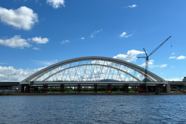 哈萨克斯坦阿斯塔纳市轻轨一期伊希姆河钢拱桥项目该拱桥位于哈萨克斯坦总统府旁,桥长155m,为下承式简支系杆拱,主拱矢高2m,拱肋和主梁均采用钢结构,拱肋采用钢箱拱,主梁为钢结构纵横梁体系。 -